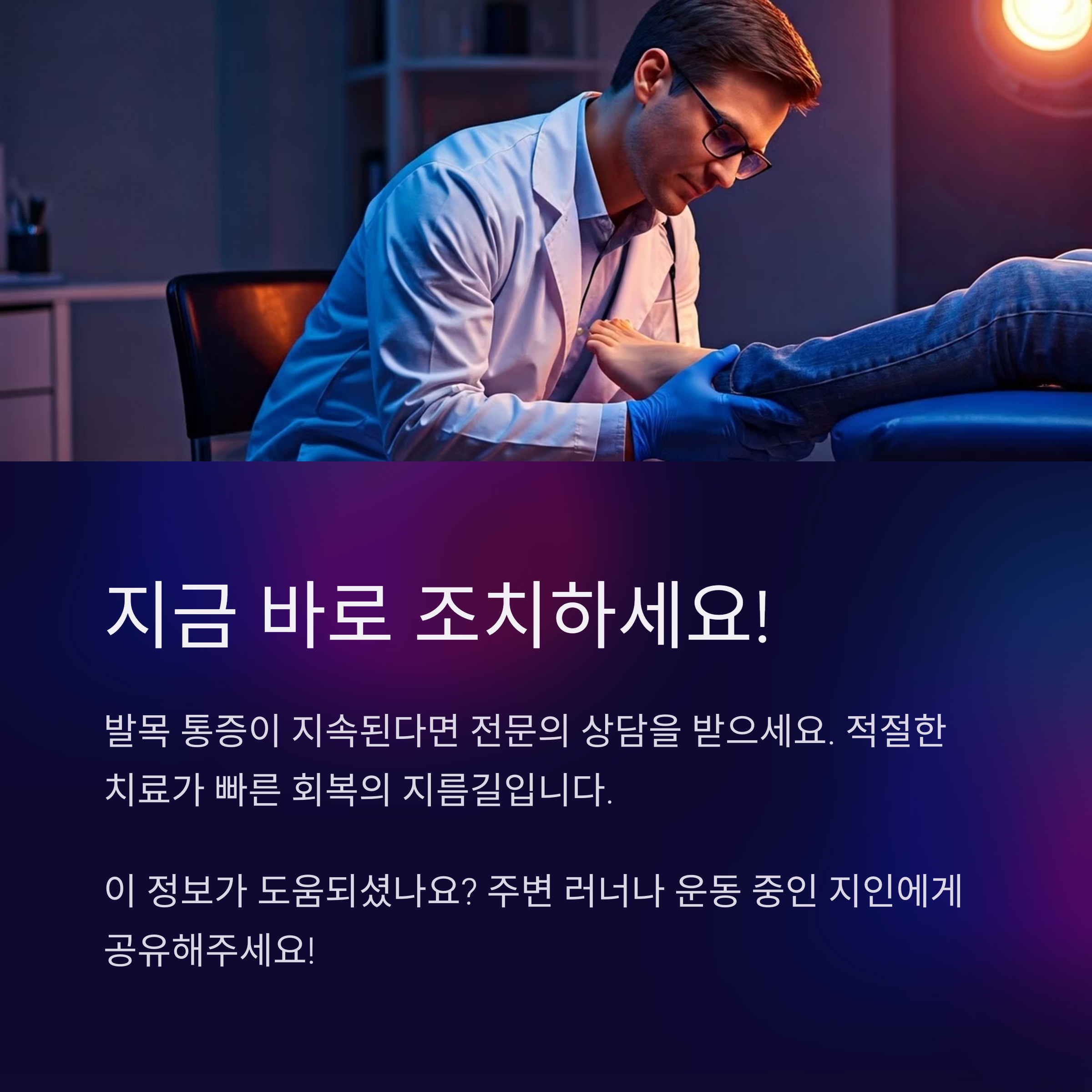 발목이 붓고 안쪽이나 뒤쪽 통증이 지속된다면, 단순한 염좌로 방치해서는 안 됩니다. 다음과 같은 상황에서는 병원 진료가 반드시 필요합니다. - 휴식을 취해도 통증이 줄어들지 않고 3일 이상 지속되는 경우 - 붓기가 심해지거나 멍이 넓게 퍼지는 경우 - 체중 부하 시 통증이 극심해 정상 보행이 불가능한 경우 - 국소적으로 뼈를 눌렀을 때 찌릿하거나 날카로운 통증이 느껴지는 경우 이러한 증상은 단순한 연부조직 손상이 아닌, 골절 또는 골막 손상일 수 있으며, 조기 진단과 고정 치료가 회복 속도를 크게 좌우합니다. MRI나 뼈 스캔 등의 정밀 영상 검사는 초기 피로골절 확인에 특히 효과적이며, 전문가의 지도 하에 재활치료를 병행하는 것이 재발 방지에도 도움이 됩니다.