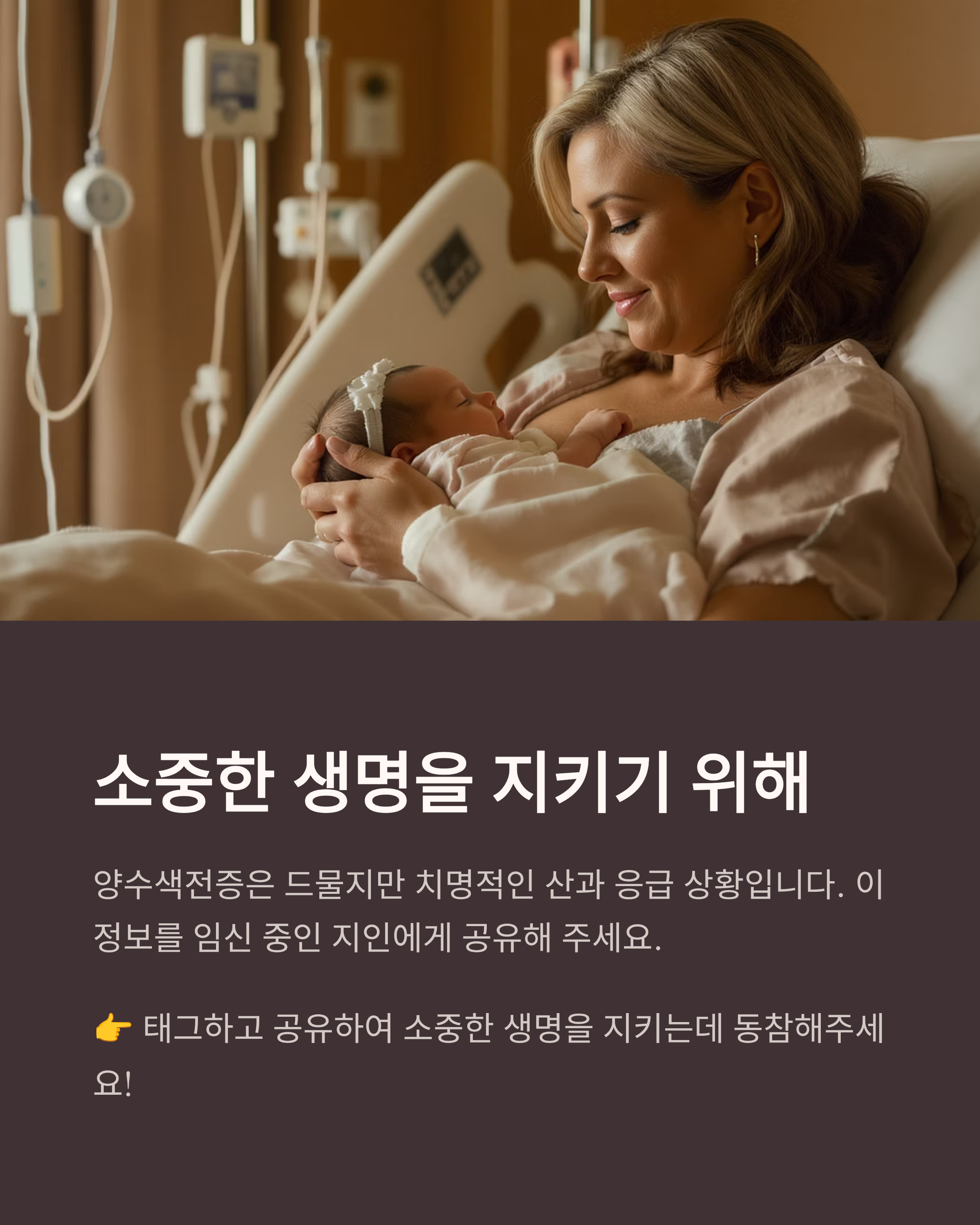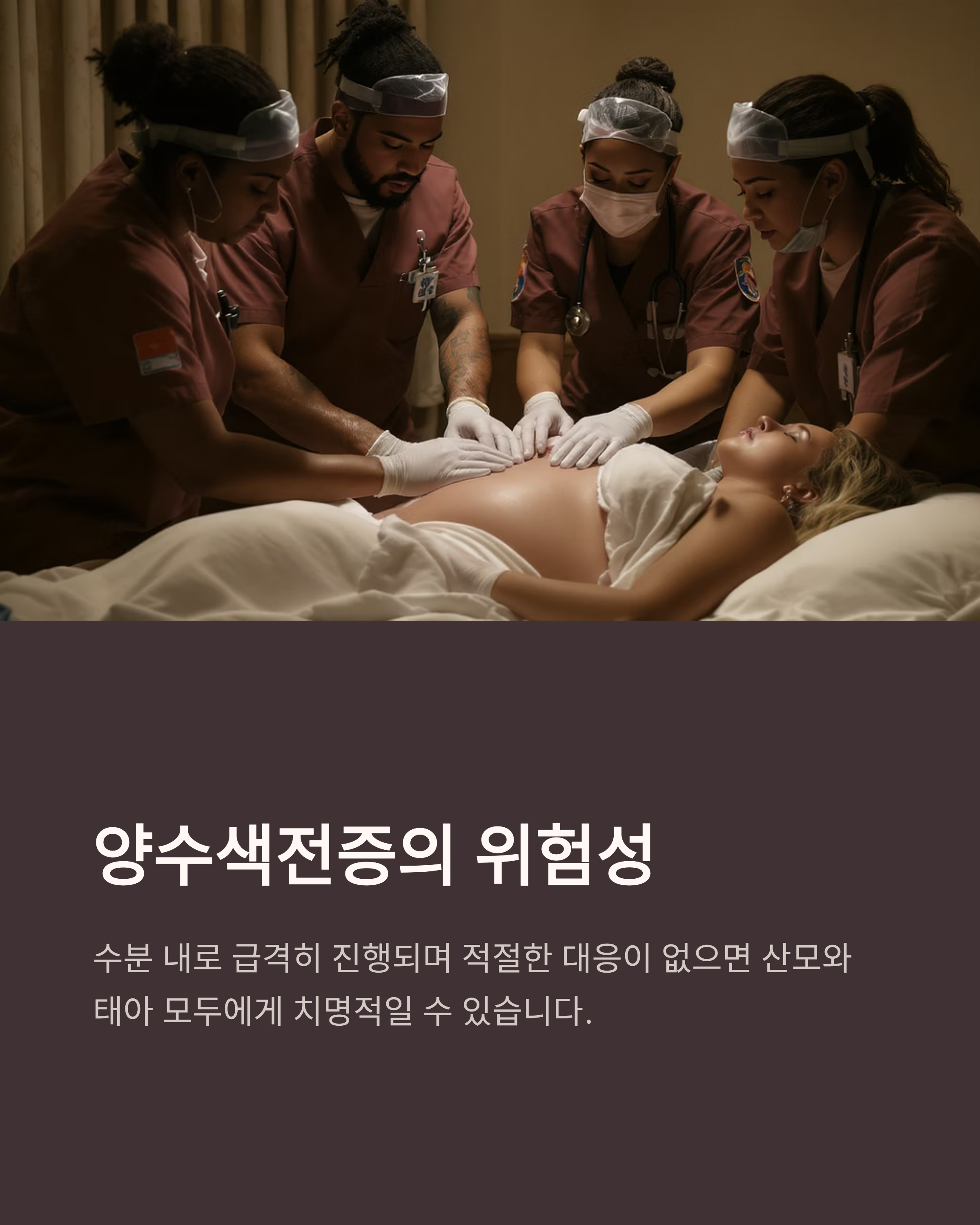 결국 양수색전증은 발생 자체를 막는 것이 어렵기 때문에, 예측 가능한 위험 요소를 조기에 인지하고, 고위험 산모를 면밀히 관리하는 것이 가장 현실적인 대처 방안입니다.