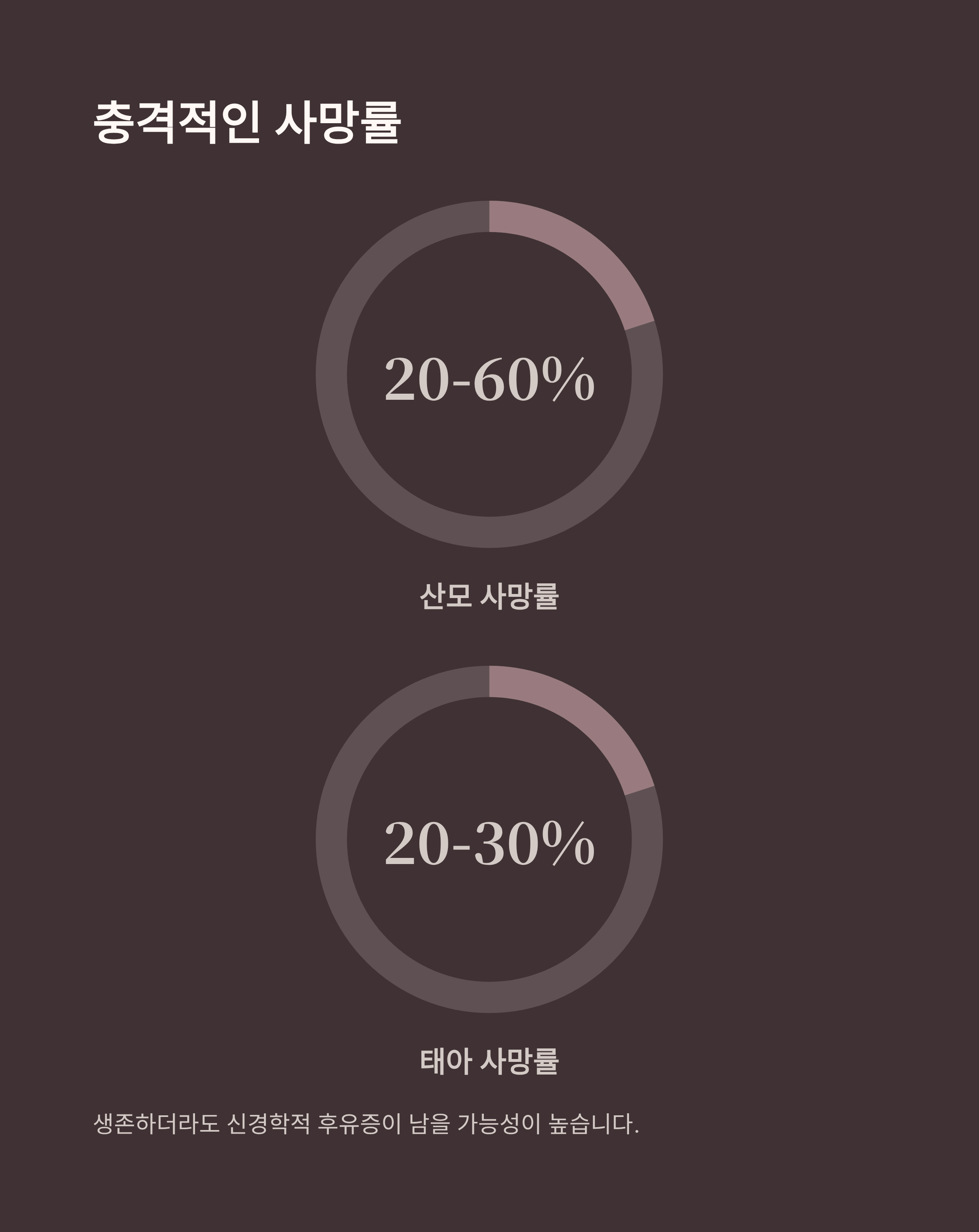 또한 생존하더라도 약 40%의 환자는 영구적인 신경학적 손상을 겪을 수 있으며, 장기 손상, 난청, 기억력 상실, 언어 장애 등의 후유증이 남을 수 있습니다. 산모뿐 아니라 태아도 위험에 처할 수 있어, 태아 사망률 역시 20~30%를 넘습니다.