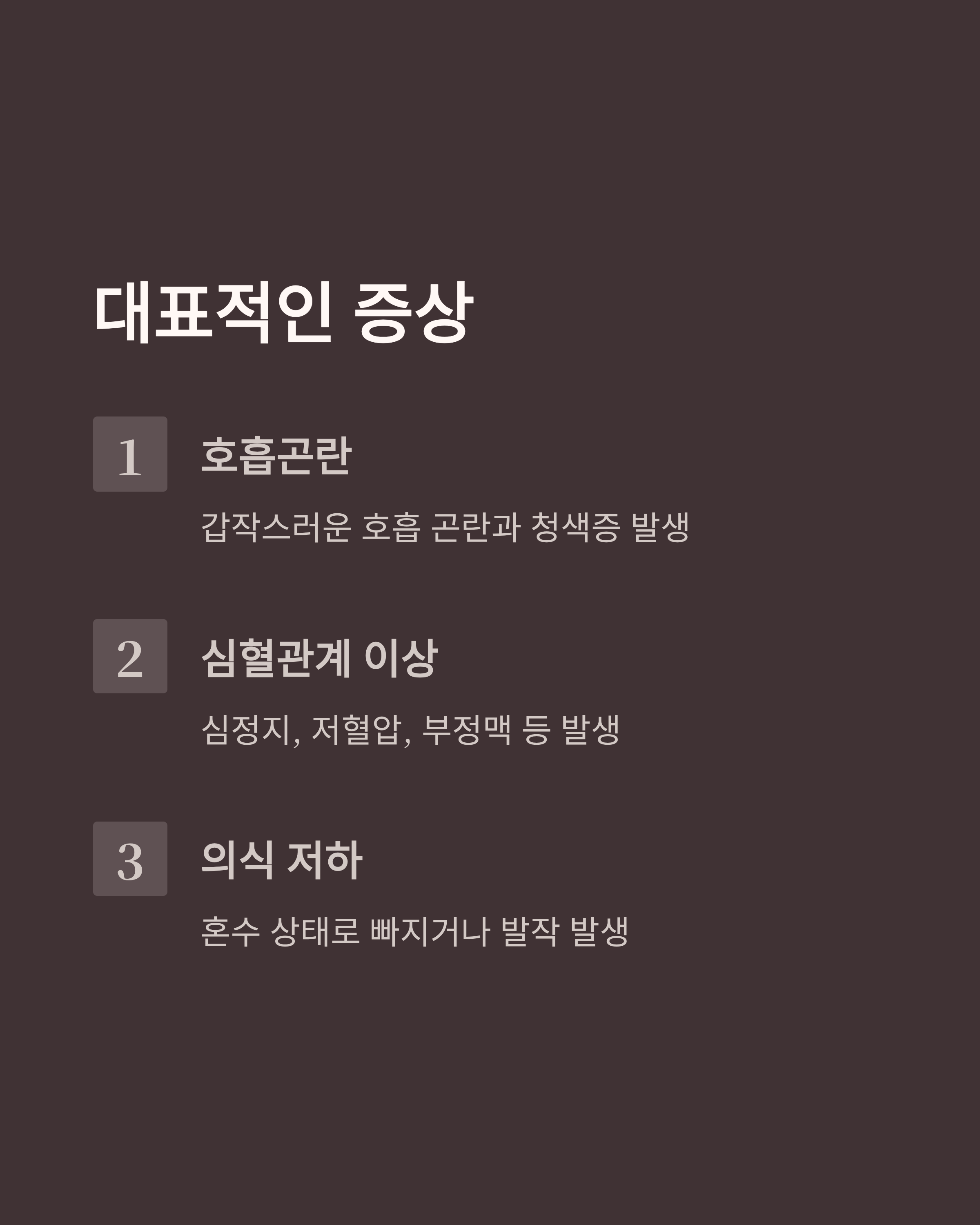 - 급성 호흡곤란 — 산소 공급 부족으로 인한 청색증, 의식 혼미