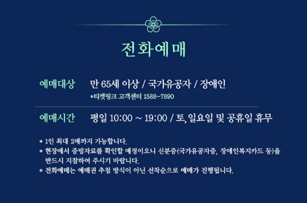 만65세 이상/ 국가유공자/ 장애인 분들에 한해서 전화예매가 가능합니다.