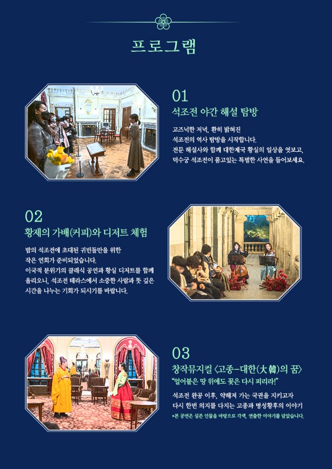 덕수궁 밤의 석조전 프로그램으로는 석조전 야간 해설탐방, 황제의 가배(커피)와 디저트 체험, 창작뮤지컬인 고종-대한의 꿈 관람이 있습니다.