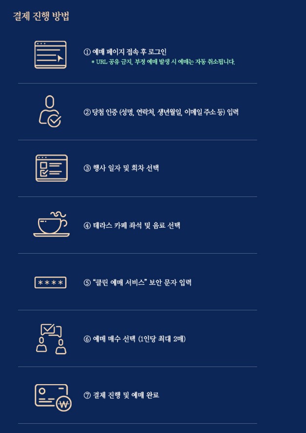 - 100퍼센트 사전예약제로 운영되며 별도의 현장판매는 진행되지 않습니다.