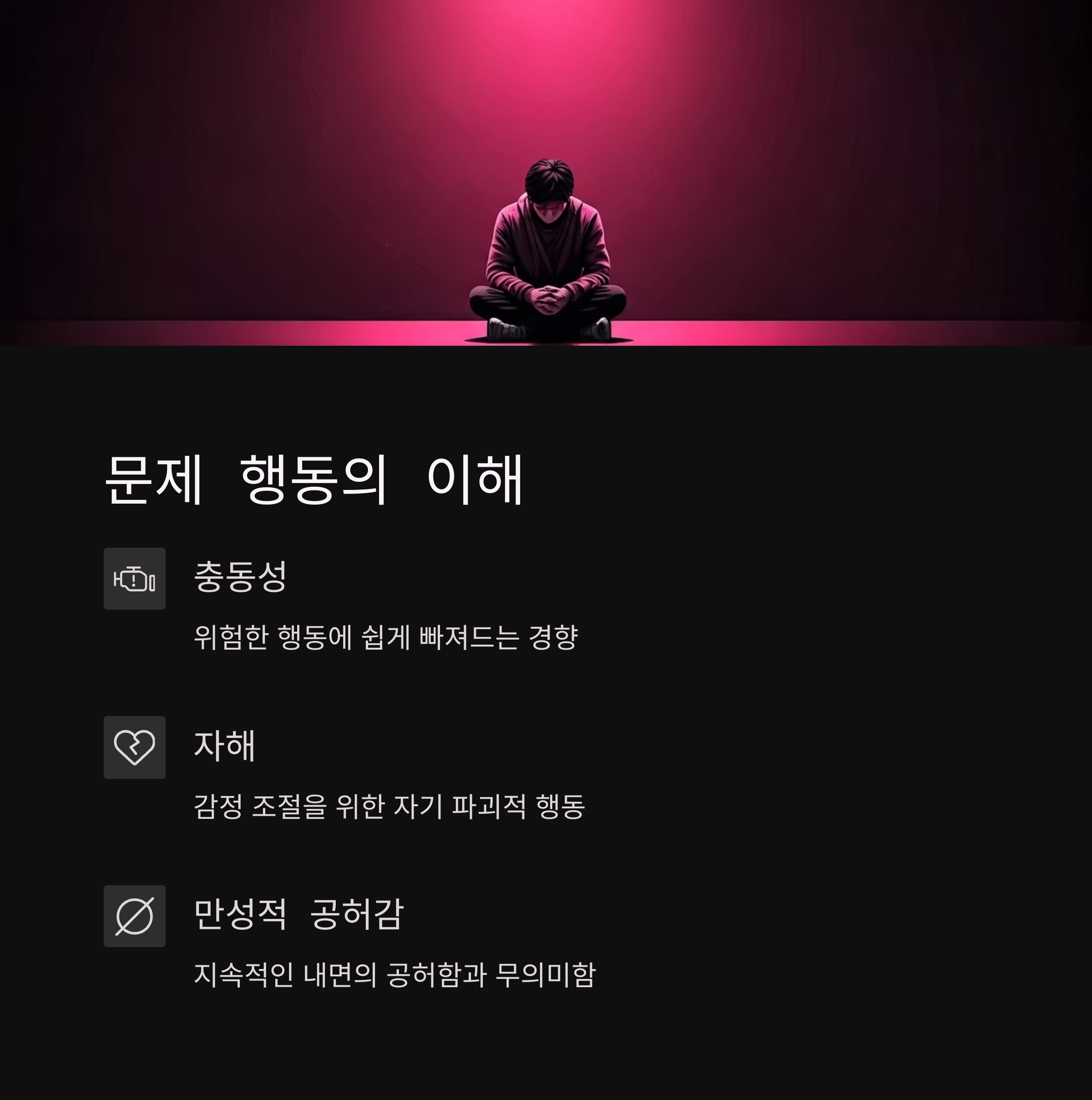 이 외에도 충동적인 행동, 자해 시도, 약물 남용, 식이장애 등 다양한 형태의 문제 행동이 동반될 수 있으며, 이는 자신을 통제하지 못하는 데서 오는 결과입니다. 무엇보다 경계선 인격장애 환자는 스스로 공허하고 무가치하다고 느끼는 경향이 강하며, 이는 만성적인 자존감 저하로 이어질 수 있습니다.
