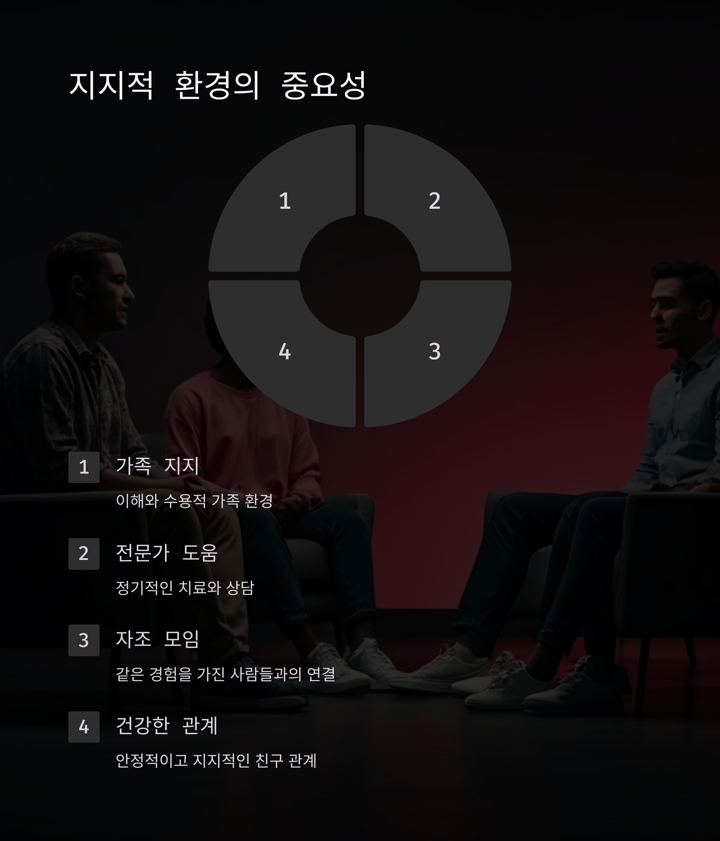 무엇보다 중요한 것은 자기 자신을 있는 그대로 수용하는 자세입니다. 자신을 비난하거나 다른 사람과 비교하기보다는, 작은 성장을 긍정적으로 받아들이는 태도가 치료의 중요한 기반이 됩니다. 또한 주변 사람들과의 건강한 관계 회복 역시 병의 호전을 돕는 핵심 요소입니다.