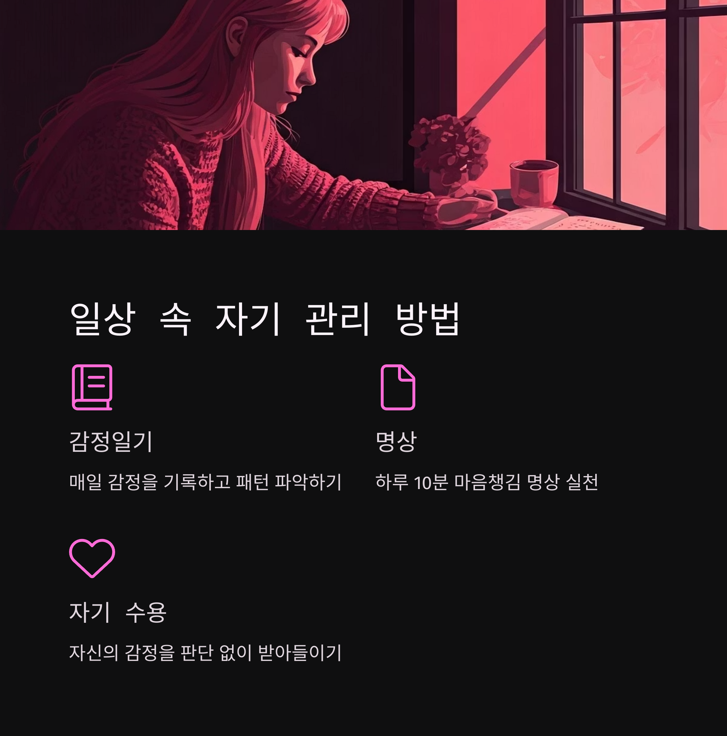 경계선 인격장애를 가진 사람들은 일상에서도 다양한 어려움에 부딪힐 수 있습니다. 때문에 치료와 더불어 생활 습관 관리가 매우 중요합니다. 첫 번째로 감정일기 쓰기나 감정 추적 앱을 활용해 감정의 흐름을 기록하고 분석하는 것이 도움이 됩니다. 이를 통해 자신의 감정 패턴을 인식하고, 폭발적인 반응을 미연에 방지할 수 있습니다.