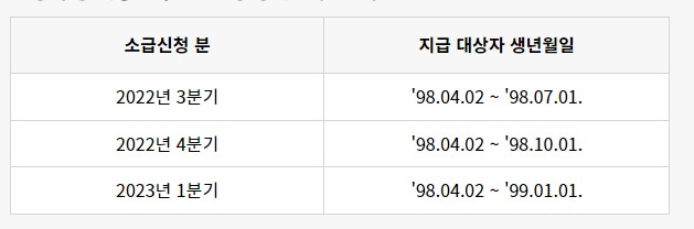 또 한 가지 예를 들자면 98년 10월 2일생 청년이 처음으로 신청하는 경우 2023년 1분기를 지급받지 못했으므로 2023년