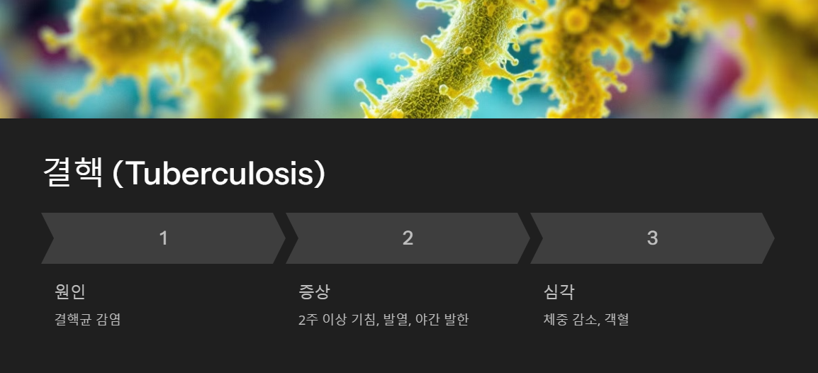결핵은 결핵균에 의해 발생하는 감염성 질환으로, 만성 기침이 대표적인 증상입니다.