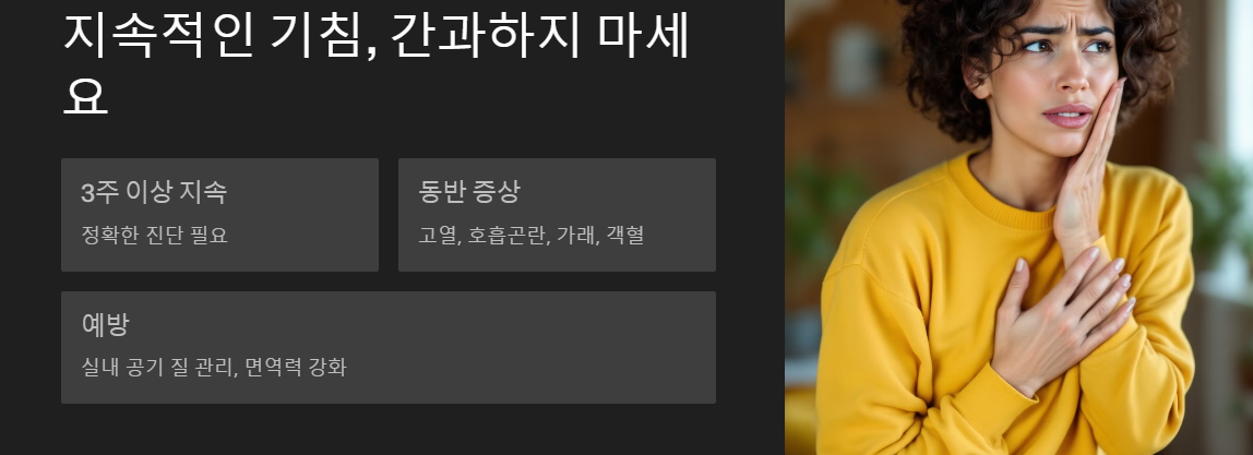 또한, 기침이 반복되지 않도록 평소 실내 공기 질을 관리하고, 면역력을 높이기 위해 균형 잡힌 식단과 규칙적인 운동을 실천하는 것이 좋습니다.